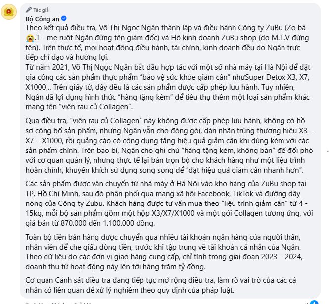 Theo cảnh sát, Ngân 98 thành lập Công ty TNHH Thương mại dịch vụ ZuBu và hộ kinh doanh ZuBu Shop, nhưng để người khác đứng tên làm giám đốc, trong đó có mẹ ruột.